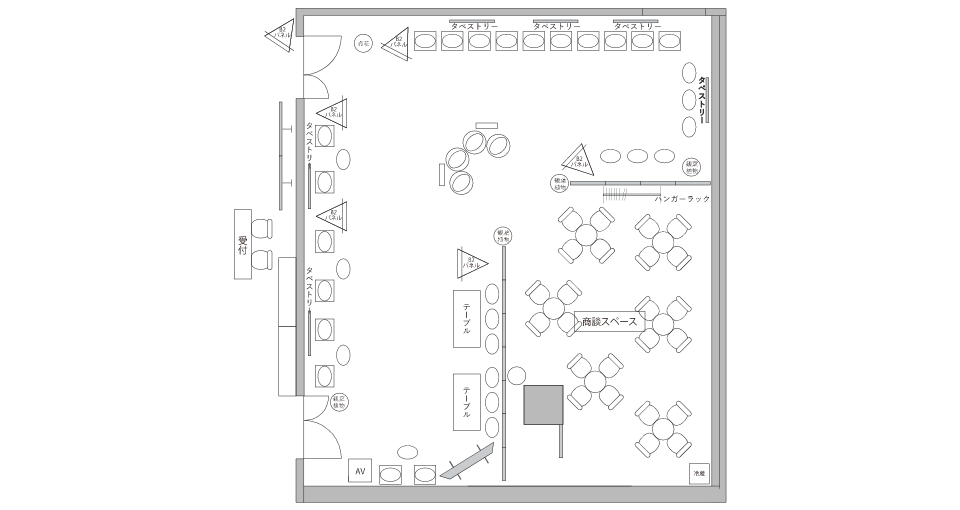 高い天井と2面ガラス張りで明るく開放的なTerrace Roomは展示会におすすめのお部屋です。壁面にはピクチャーレールが付いているので、タペストリーを吊るすこともできます。スポットライトの使用やお持込みの植栽でいつもの会議室とは雰囲気が一変、素敵な展示会場になりました。